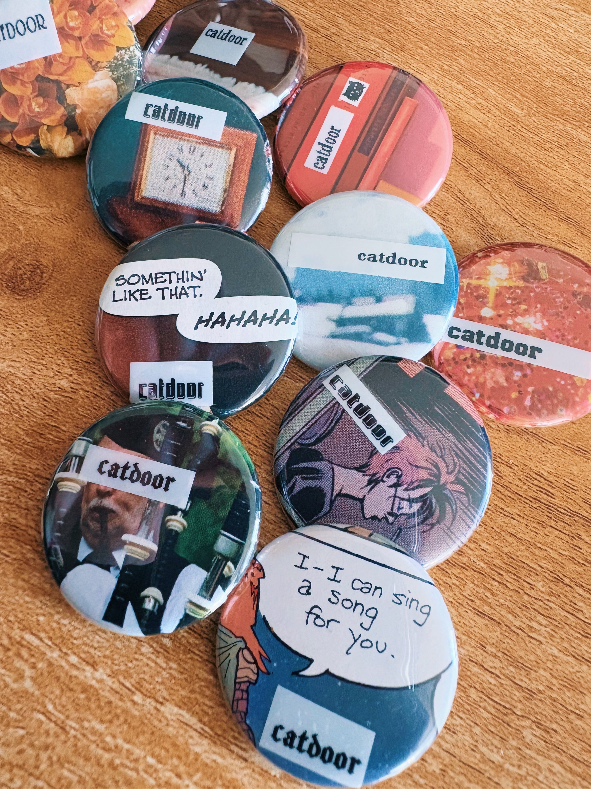 My husband & I hand-make these little gems using vintage comic books, old magazines, our caddy full of random art supplies, and my handy-dandy label maker. You can let us choose for you or click the option below for customizing your very own “catdoor” button.